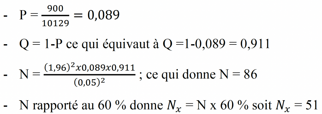 - P : nombre d’enquêtés de la structure/nombre total d’enquêtés de l’ensemble de toutes les structures choisies pour mener l’étude de la recherche ;