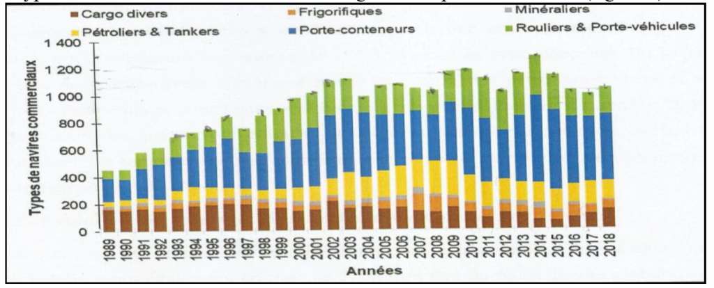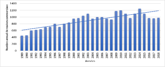 Une analyse de la figure 2 révèle que le trafic annuel des navires commerciaux a été multiplié par 2,29 en passant de 458 navires en 1989 à 1047 en 2018, soit une moyenne annuelle de 942 navires commerciaux. De 1989 à 1998, le nombre de navires a connu une progression de 86,46% avec une moyenne décennale de 677 navires.