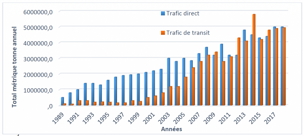Figure 5 : Évolution des trafics directs et de transit du port de Cotonou de 1989 à 2018