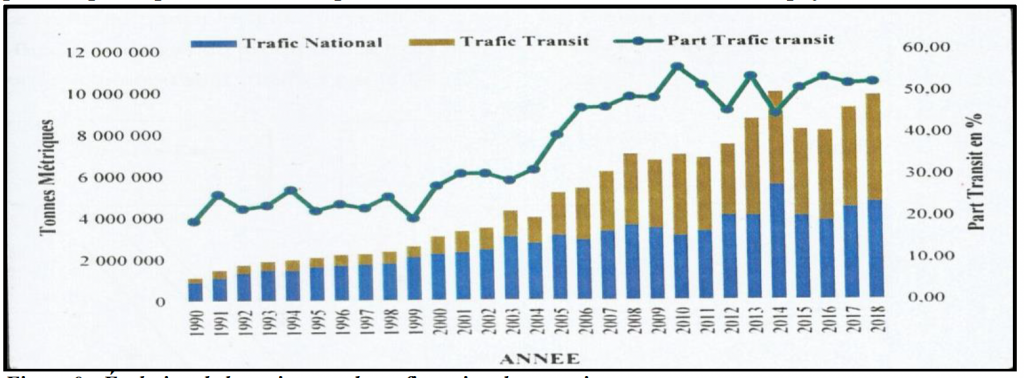 De l’analyse de la figure 9, il ressort que le trafic de transit a connu une croissance progressive de 1990 à 2018 jusqu’à égaler le trafic national qui était autrefois majoritaire. On a enregistré de 2010 à 2018 que la part de transit dans le trafic total a dépassé le seuil de 50 %. En effet, on a : 2010 (55,83 %) ; 2011 (51,48 %) ; 2013 (53,49 %) ; 2015 (50,82 %) ; 2016 (53,32 %) ; 2017 (51,9 %) ; 2018 (52,14 %) tandis que pendant les périodes de 2012 et 2014 une légère baisse de cette part s’observe en dessous de 50 % soit respectivement 45,4 % et 44,61 %.