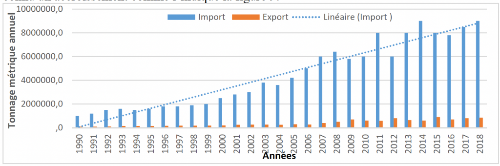 Les trafics annuels imports et exports du port de Cotonou sur la période de 1990 à 2018 ont connu un accroissement comme l’indique la figure 9.