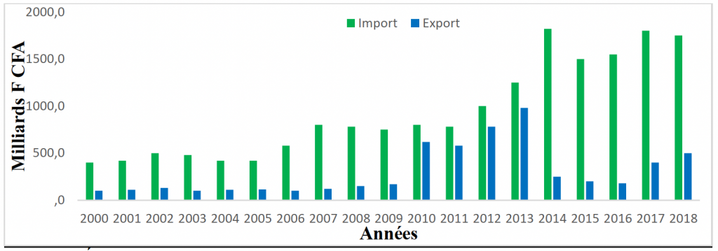 Figure 12 : Évolution des valeurs des imports et des exports du Bénin de 2000 à 2018.