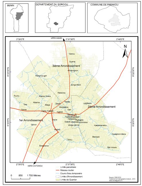 Parakou est la plus grande ville du nord du Bénin et chef-lieu de la préfecture du département du Borgou. Elle est située sur la route principale traversant le Bénin du nord au sud. Elle est reliée à Cotonou par la voie goudronnée principale inter-état, la plus fréquentée d’ailleurs, et également par la ligne de chemin de fer Bénin-Niger non fonctionnelle. Parakou est limité au sud, à l’est et à l’ouest par la commune de Tchaourou et au nord par la commune de N’Dali (carte 1). Elle présente une morphologie essentiellement caractérisée par un noyau urbain, les extensions Sud, Nord et Est et les zones Ouest et Nord-ouest (Nouatin and Bachabi, 2010, p.4).