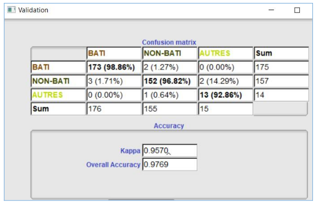 Après la segmentation, vient l’étape de la classification. Celle-ci consiste à attribuer à chaque segment la catégorie d’occupation du sol correspondante. Il faut souligner que l’interprétation visuelle des images après la composition colorée a permis d’identifier des types d’occupation et donc de délimiter les zones d’entrainement. La délimitation de ces zones d’entrainement fut renforcée par le réseau des données de GPS collectés sur le terrain. Une fois la classification terminée, des traitements ont été effectués pour affiner l’évaluation de la précision et valider les résultats. Enfin, la précision des classifications a été évaluée à travers l’utilisation d’une matrice de confusion. A cet effet, les résultats des classifications ont été confrontés à l’ensemble des relevés de GPS collectés sur le terrain. La superposition des classes bâties à deux dates successives permet de cartographier l’évolution du bâti alors que la matrice des changements permet de la quantifier.