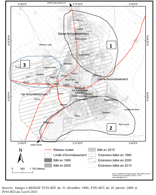 La carte résultant de la comparaison des classifications d’occupation du sol de 1990, 2000 et 2015 montre que les extensions du bâti se concentrent vers le sud-est (zone 2) et vers le nord- est (zone1) de la ville de Parakou. Cette croissance de la tache urbaine s’observe aussi progressivement vers l’ouest (Zone 3). Ce processus a concerné les quartiers Zongo-Nord, Amaouignon, Guema et Ganou sur la route de Malanville et les quartiers Sinangourtou, Kpégamanakou et Banikandi sur la route de Savè. Les extensions sud et nord caractérisées par l’habitat populaire et les activités commerciales et artisanales, les extensions de l’est, abritant les équipements et infrastructures départementaux et la zone ouest et nord-ouest regroupant les grandes activités industrielles et de transport ferroviaire et aéroportuaire, ainsi que l’habitation de populations à l’extrême Ouest. Le village de Tourou et les quartiers Albarika et Tibona se sont même rejoints dans le courant de 1990 et 2000. Dans les zones 1,2 et 3, s’observe un remplissage progressif des espaces interstitiels tandis que dans les périphéries de la ville une extension se remarque.