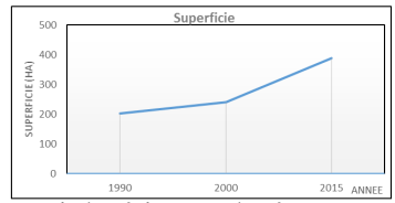 La figure 2 montre la courbe d’accroissement de la surface bâtie à Parakou durant la période de l’étude. L’analyse de cette figure permet de distinguer deux grandes périodes de l’accroissement urbain. La période de 1990 à 2000 où l’accroissement est lent et progressif et la période 2000 à 2015 caractérisée par un accroissement rapide du nombre de bâti.