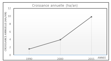 Les surfaces de l’ensemble de la tâche urbaine entre 1990, 2000 et 2010 montrent une différence variable entre elles. La surface urbaine totale (ensemble des surfaces bâties constituées de bâtis denses, de bâtis résidentiels, de grands bâtiments et de chantiers urbains) représentait 1026,72 ha pour la période de l’étude (Tableau 1). Entre les trois dates, les étendues bâties ont augmenté de 237 ha, soit un taux d’accroissement de 12,20% en 25 ans. L’accroissement annuel moyen entre les différentes dates calculées a permis de réaliser le tableau ci-dessous.