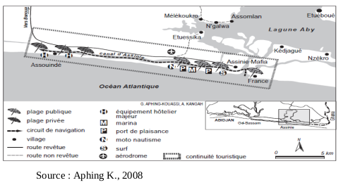 Situé à l’Est du littoral ivoirien dans la région du Sud Comoé, le littoral d’Assinie connaît une importante dégradation de son environnement côtier depuis l’érection de cette localité en zone touristique en 1970 (A. C. Hauhouot, 2010, p.315).