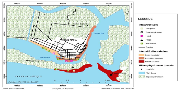 L’élévation du niveau de la mer détruit les activités anthropiques. Durant la saison pluvieuse, l’inondation affecte les rives de moins de 5 mètres et accentue la dégradation et la destruction des activités économiques et touristiques. L’inondation sévit périodiquement dans les quartiers d’Assinie France et de Mafia (carte 5).