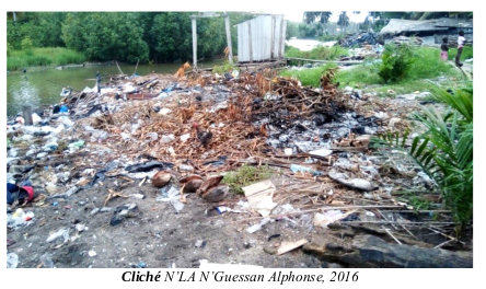 Les activités anthropiques entrainent la dégradation de l’environnement du littoral et du cadre de vie de la population. Les pratiques environnementales de la population, essentiellement constituées d’opération de rejet et d’incinération de déchets solides, polluent des plans d’eau lagunaire et marines. La production des déchets solides enregistre 92% des ordures ménagères et proviennent des activées touristiques ou des ménages. Le mode de traitement des déchets reste faible. En effet, 65% des déchets collectés sont brûlés, soit déversés dans la broussaille ou dans la lagune. La concentration des déchets sur la rive entraine des modifications sur l’écosystème côtier (photo 5)