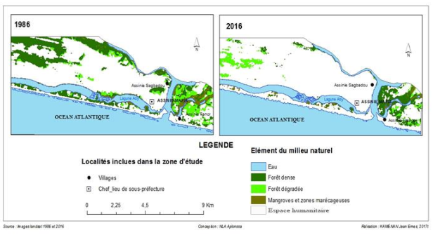 Carte 2 : Dynamique des espaces naturels à Assinie entre 1986 et 2016