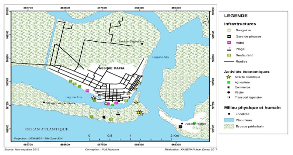 Quant au commerce, son développement à Assinie est essentiellement dominé par les activités de restaurants, des maquis, des bars, des boutiques et des supermarchés, des quincailleries, des commerces de nuits (vente de poisson, de viande de bœuf et de poulets braisée) et de marché. Le caractère particulier de ce commerce est mis en rapport avec le tourisme avec la production de nombreux déchets qui jonche les plages et en bordure des plans d’eau lagunaire sans toutefois occulté la gestion problématique des déchets ménagers dans les villes africaines. En outre, le commerce par extraction de sable génère beaucoup de revenus et se définit comme un secteur prometteur économiquement. Cependant, il contribue au « dé-engraissement » des côtes. Au regard de ces différentes activités exercées à Assinie, la plupart des activités pratiquées sont situées dans le périmètre des rivages mer-lagune avec la prédominance des activités touristiques (Carte 3).