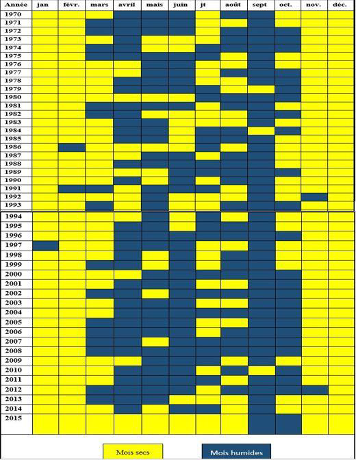 Sur la période 1970-2015, quatre décennies peuvent être observées. Ainsi, de 1970 à 1979, on compte 69 mois secs et 51 mois humides. On note également75 mois secs contre 45 humides entre 1980 et 1989.De 1990 à 1999,73 mois secs contre 43 humides ont été dénombrés. Pire,au cours de la dernière décennie (2000-2015), 101 mois secs ont été révélés contre et 91 mois