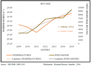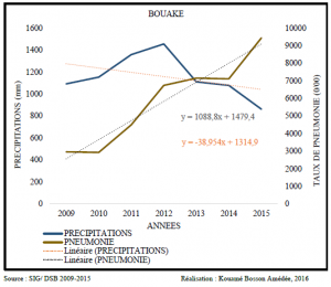 Le climat de la ville de Bouaké a connu des variations sur la période 1970-2015 au regard des hausses thermiques et de la baisse des précipitations. Les consultations hospitalières pour les cas de pneumonie augmentent également selon les années. Parallèlement aux variations des températures ou des précipitations, les cas de prévalence de pneumonie augmentent dans cette