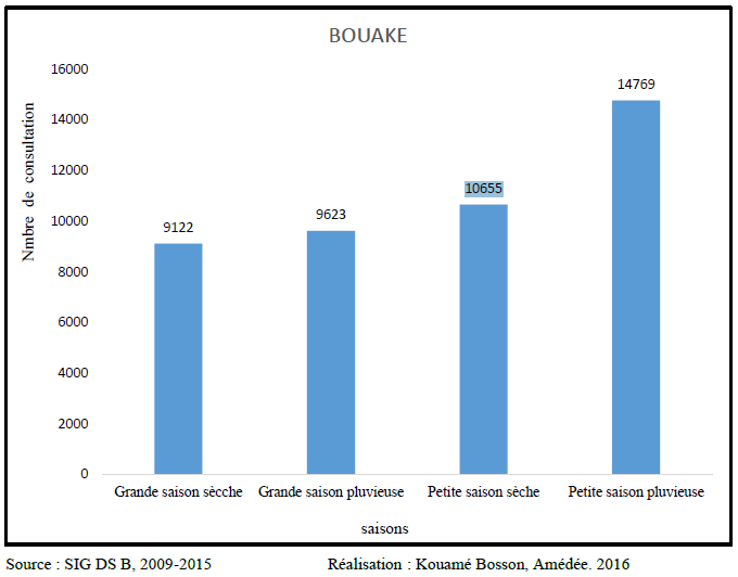 En fonction des quatre saisons climatiques de l’année observées dans la zone d’étude, l’on peut faire les remarques suivantes : la petite saison pluvieuse a plus de cas de morbidité avec un total de 14789 patients enregistrés dans les centres de santé de Bouaké.