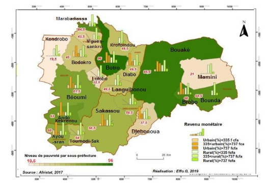 Au regard de cette carte, le département qui présente la plus faible proportion de population rurale concernée par l’extrême pauvreté (revenu monétaire inférieur à 335 FCFA/jour/personne) est celui de Béoumi (24,79%), tandis que le département de Bouaké présente une proportion plus élevée (33,36%) de population rurale concernée par l’extrême pauvreté. Pour ce qui est de la pauvreté en milieu urbain, le département de Bouaké et Béoumi enregistrent respectivement 9,25% et 19,29% de populations ayant un revenu inférieur à 335 F CFA. Cette situation monétaire est préoccupante, car elle a des effets négatifs sur la capacité des ménages à faire face aux besoins alimentaires, puisque leur pourvoir d’achat est limité.