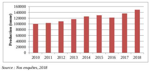 Le manioc connaît une évolution croissante de sa production, depuis des années. Celle-ci est passée de 100 024,5 tonnes en 2010 à 149 254,5 tonnes en 2018, soit un taux de croissance global de 49,21%, en espace de 8 années. Cependant, cette croissance n’est pas linéaire, elle a connu une légère baisse de 14 324 tonnes soit 11%, en 2016. Cette chute de la production s’explique par la sècheresse observée à cette période et la forte demande en manioc, des pays limitrophes. Cette situation a créé une pénurie de manioc sur le marché local ainsi que sur le marché national. L’augmentation des volumes de manioc engendre nécessairement une disponibilité de ses sous-produits.
