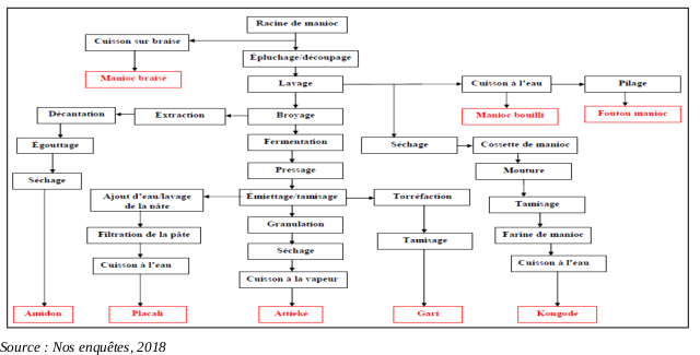 Dans la région de Gbêkê, les enquêtes ont révélé que le mode de transformation du manioc est toujours dominé par la transformation artisanale et familiale. Cette méthode est très diversifiée et différente selon le type de produit obtenu (figure 3).