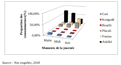 La consommation de l’attiéké est préférée les matins et midis par 72,72% et 60,3% des enquêtés. Bien que concurrencé par le placali (28%), le foutou est la forme la plus appréciée au repas du soir avec un taux de 48%. Quant au gari, il est plus préféré au déjeuner du matin (6,81%). Le kongodé et le manioc bouilli ont des préférences de consommation très marginale à tout moment de la journée. Plusieurs raisons sont avancées par les enquêtés au sujet de la préférence à ces moments de la journée. Ces raisons sont entre autre la valeur nutritive du manioc, l’accès facile à tout moment sur les marchés, un aliment lourd et consistant permettant de bien travailler et facile à cuisiner.