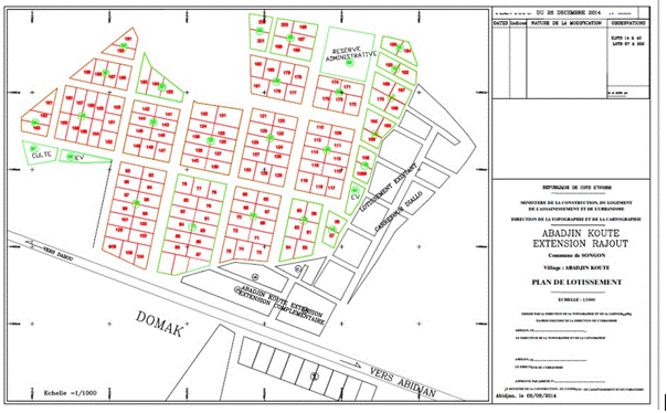 Les plans de lotissements recensés sont au nombre de deux cent trente et un (231). Ils sont pour la plupart totalement nus ou partiellement bâtis. Ces plans ont été conçus par des promoteurs, des experts géomètres agrées mandatés par les villages ou mairies d’Abidjan.