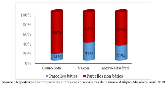 L’examen de la figure 4 montre que, les parcelles bâties sont relativement élevées dans les arrondissements d’Akpro-Missérété et dans celui de Vakon soit 31 % et 37 %. A Gomè-Sota, la proportion est relativement faible soit 14 %. Ce faible taux du nombre de parcelles bâties dans l’arrondissement de Gomè-Sota s’explique en partie par le niveau de morcellement des domaines dans cette localité. De vastes domaines portant ou non une plaque d’identification, ayant subi ou non des transactions sont restés inoccupés ou faiblement mis en culture.