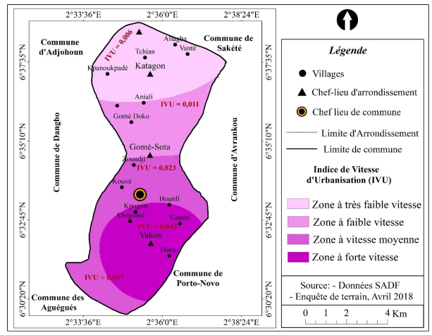 La carte 5 montre qu’après l’arrondissement d’Akpro-Missérété et l’arrondissement de Vakon subissent une forte pression urbaine rapportée à leur superficie avec respectivement IVU = 0,043 et IVU = 0,037. Ces deux arrondissements sont suivis par ordre d’importance de ceux de Gomè-Sota et de Katagon (avec respectivement IVU = 0,023 et IVU = 0,011). Cette carte peut constituer un véritable outil d’aide à la décision en ce sens qu’elle donne des indications pour sélectionner les localités auxquelles les autorités devront accorder la priorité en matière d’aménagement urbain afin de minimiser les risques d’une mauvaise maîtrise de l’urbanisation.