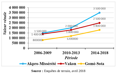 La spéculation dans la commune d’Akpro-Missérété se traduit par la dynamique des valeurs vénales. Eu égard à la forte demande de parcelles pour la construction de logements, des fonctionnaires et des revendeurs de terre prennent d’assaut les friches et les jachères des arrondissements tels que Gomè-Sota, Vakon, et Akpro-Missérété. Ils y acquièrent de vastes superficies qu’ils sécurisent parfois avec des titres fonciers. Ainsi, plusieurs hectares de terres sont achetés et font l’objet d’une rétention spéculative. Ainsi, les prix de vente des parcelles connaissent une ascension fulgurante. Alors qu’une parcelle de 300 m² coûtait 20 000 F en 1970, il faut désormais débourser 200 000 CFA pour l’acquérir en 2000. Soit une augmentation de 180 000 F en 30 ans. Dans les arrondissements déjà lotis tels que Vakon, Gomè-Sota et Akpro-Missérété, l’achat est le mode d’accès au foncier le plus développé bien qu’il ne se substitue pas totalement à l’héritage. De 2006 à ce jour, les prix des parcelles ont évolué selon la disponibilité et la demande en terres constructibles. L’évolution du prix moyen d’une parcelle de 300 m² varie d’un arrondissement à un autre (figures 2).