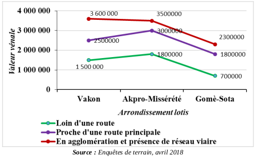L’analyse de la figure 2 montre que le prix des parcelles a grimpé se traduisant par une progression rapide de la courbe entre 2013 et 2018. Cette situation s’explique par la forte implication des citoyens dans les transactions foncières dans les arrondissements de Akpro- Missérété et de Vakon. Dans ces localités la demande ne suit pas la disponibilité de terre à la différence de l’arrondissement de Katagon, où il y a une grande disponibilité foncière. Les revendeurs préfèrent les domaines s’étendant sur plusieurs hectares aux parcelles de 300 m2 car, ils réalisent une plus grande marge bénéficiaire en procédant à l’émiettement de ces domaines. Par ailleurs, il faut noter que le coût des terrains est fonction de leurs situations géographiques et dépend également de l’existence ou non du réseau viaire. La valeur d’une parcelle varie donc selon sa position, qu’elle soit en agglomération, au bord d’une route principale, d’une route secondaire ou loin d’une route et d’une agglomération (figure 3).
