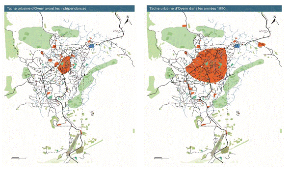 Figure 1 : Tâche urbaine d’Oyem en 1954 (108 ha). Figure 2 : Tâche urbaine d’Oyem en 1990