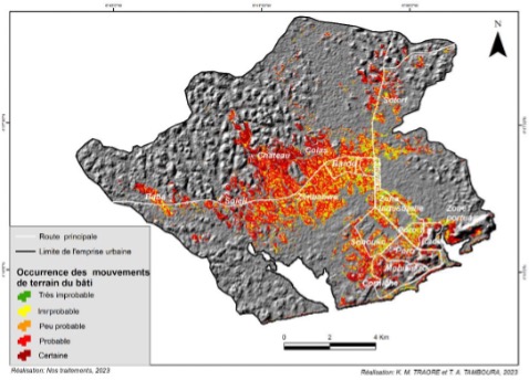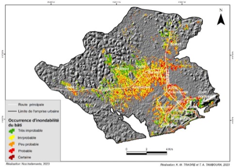 « Très improbable » et « Certaine » (carte 6). Cette susceptibilité s’avère importante dans les quartiers centraux (Séwéké, Bardo, Poro, Zone industrielle) et Sonouko sur espaces marécageux et sols alluvionnaires (carte 6). Ces sols sont constitués de vases et de tourbes gorgés d’eau et facilement inondables.
