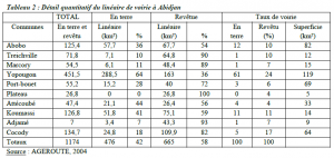 Après les années 2000, l’espace métropolitain abidjanais dispose encore, en terme quantitatif de linéaire de voies, en terre ou revêtue ; traduisant ainsi une spatialité non négligeable bonne du revêtement du réseau de voirie à Abidjan (Tableau 2 : Détail quantitatif du linéaire de voirie à Abidjan).