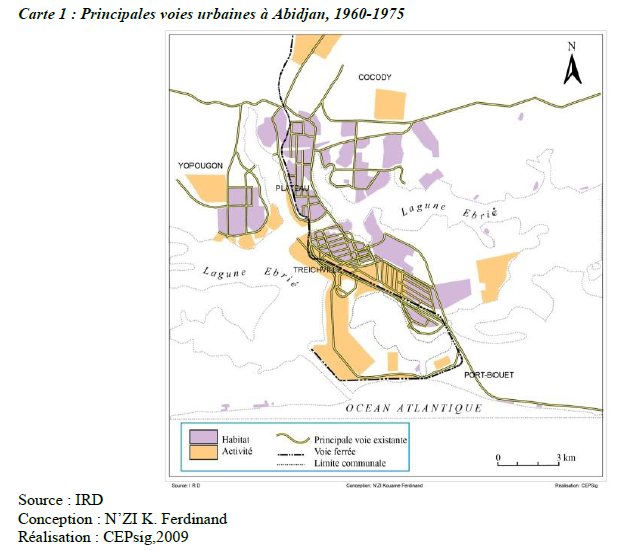 Dès 1926, les premiers instruments d’une politique de l’habitat à Abidjan seront mis en place par l’administration coloniale. Pour la gestion de cette politique, l’office des habitations économiques (ohe) sera créé. Le décret de 1949 en fixera les objectifs et le premier cadre général de production de logements économiques sera mis en oeuvre. C’est à partir du plan Badani, en 1948, que la structuration de l’espace urbain abidjanais prendra réellement appui sur cette politique de logements publics. Elle sera orientée par une voirie urbaine naissante. Les travaux d’aménagement pour cette voirie verront en 1940, la création d’un pont élévateur, puis la construction, d’un pont fixe, le pont Félix Houphouët Boigny, en 1958. Dès les années 1950, l’espace urbain abidjanais laisse ainsi apparaître un zoning fonctionnel, par le truchement de deux (2) zones d’influence (Carte1 : Principales voies urbaines à Abidjan, 1960-1975), d’où seront concentrées l’essentiel de la voirie et des activités humaines. La première zone plus au Sud, abrite le canal de Vridi (1950) et le Port d’Abidjan (1951). Plus au Nord, la seconde zone d’influence, présente une surface bâtie, estimée à environ 33.685 ha (sihci, 1952), qui se structure autour des communes du Plateau et d’Adjamé. Aussi, dès 1952, la Société Immobilière d’Habitation de Côte d’Ivoire (sihci), produira-t-elle près de 3750 logements à Abidjan. Cette première société fusionne avec la succi, créée en 1959. « Elle construisit dans les quartiers d’Adjamé et de Treichville, des immeubles et logements locatifs, pour les fonctionnaires et européens de la coopération » (Bernus, 1962 p.419). Les travaux d’aménagement sur le site du port d’Abidjan et du canal de vridi, constituent un bloc homogène, au voisinage du quartier de Treichville, où sont construites les premières rues et avenues de la ville. Elles représenteront l’essentiel de la voirie à cette époque. Ces premiers quartiers et ouvrages successifs seront les prémisses de l’habitat, de l’équipement et de la voirie urbaine à Abidjan.