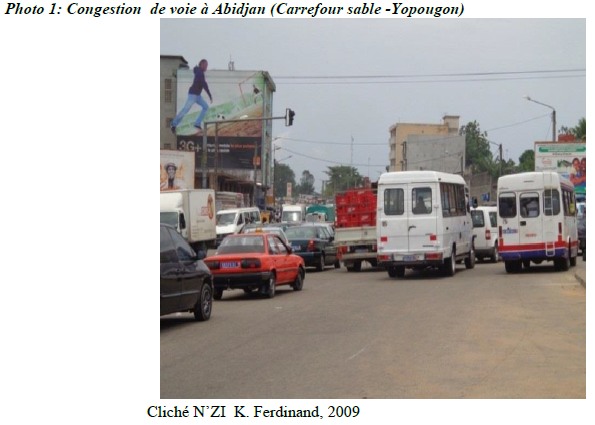 Le trafic actuel sur le réseau de voirie à Abidjan n’est que le reflet des constats faits par rapport aux contraintes de circulation sur ledit réseau. Ce sont en autres, la pression démographique, l’insuffisance des voies de communication, leur état de dégradation avancée de la voirie, un parc automobile croissant (142.000 véhicules en circulation -Rapport bilan Ministère des Transports, 2010 p.6), l’indiscipline des usagers et la surcharge des voies urbaines. Elles expliquent les difficultés de circulation et les nombreuses congestions observées sur les voies urbaines à Abidjan (Photo1 : Congestion de voie à Abidjan). Le réseau de voirie abidjanais dans sa grande partie est vieux d’un demi-siècle. Les premières voies datent des années 1950. Aussi, faut-il noter, que les activités d’entretien et d’aménagement restent coûteuses. Mais, les négliger ne peut qu’accélérer la détérioration du réseau de voirie abidjanais. Le marquage des routes fortement dégradées, concerne les 1/3 de de la voirie abidjanais (Rapport d’étude S2IC-ARC Ingénierie, de l’ageroute, 2010, p.15). La spatialité de cette détérioration de la voirie urbaine gagne progressivement l’ensemble du