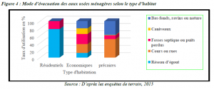 La ville de San Pédro dispose, dans les zones d’habitat loties, d’un réseau de drainage bétonné à ciel ouvert ou enterré, mis en place lors de la création de la ville. L’analyse du graphique 2 montre que les réseaux d’égout constituent à 78,5% les principaux lieux d’évacuation des eaux usées des résidents des quartiers résidentiels. Quant aux habitants des quartiers à habitats économiques, ils rejettent les eaux usées à 27,5% dans les fosses septiques. Concernant les quartiers précaires et évolutifs, les rues ou cours (photo3) constituent à 50,8% les lieux d’évacuation des eaux usées comme à Brazzaville (P. Vennetier, 1988, p. 21).Chaque ménage