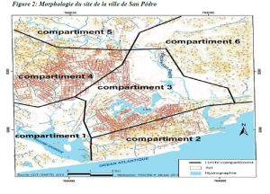 Le site de la ville de San Pédro est dans l’ensemble heurté et difficile. En effet, le relief est morcelé avec de nombreuses zones marécageuses (Ministère d’Etat, Ministère du plan et du développement, 2007, p. 100). Ce site est divisé en six compartiments séparés par un système lagunaire plus ou moins remblayé comprenant la lagune Digboué, les zones marécageuses de l’aéroport centrées sur le fleuve San Pédro situé à l’Est de la ville (carte 2).
