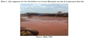 La ville de San Pédro dispose d’un réseau de drainage constitué de caniveaux à ciel ouvert ou enterrés le long de certaines de voies de communication, mis en place lors de sa création dans les quartiers légaux comme la zone industrielle au Sud. Ce système draine les eaux vers les plans d’eau (la lagune Digboué et les lacs artificiels). La présence de nombreux thalwegs facilite le drainage des eaux vers la lagune Digboué pour les quartiers situés au Sud de la route de Grand-Béréby et vers le fleuve San Pédro pour les quartiers du Nord. Le problème majeur concernant le réseau de drainage est son manque d’entretien. De ce fait, le système de drainage est défectueux et contribue à la dégradation de la voirie. Aussi, l’obstruction des caniveaux à ciel ouvert entraine le ruissellement des eaux sur les voies de communication, rendant ainsi difficile la circulation urbaine comme le montre la photo 1.