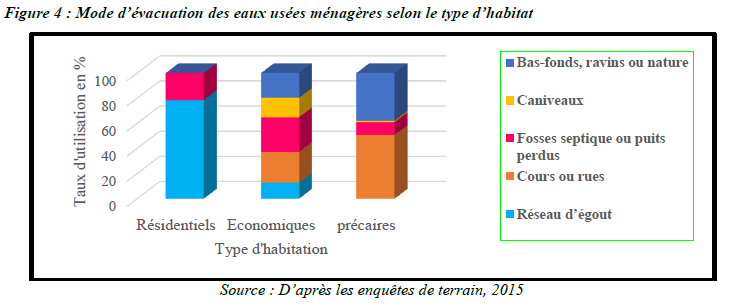 de San Pédro gère ses déchets liquides selon ses propres moyens comme à Williamsville (P. Tuo, 2015, p. 21).Pourtant,K. Dongo et al.(2008, p. 51)ont montré que « les eaux de mauvaise qualité, l’assainissement précaire et la mauvaise hygiène contribuent pour une grande partie dans la détérioration de la santé des populations ».C’est pourquoi, E. A. Z. Sy (2005, p. 69) a souligné que« la collecte, le traitement et l’évacuation des eaux sont un préalable pour un minimum de confort et de sécurité sanitaire ».