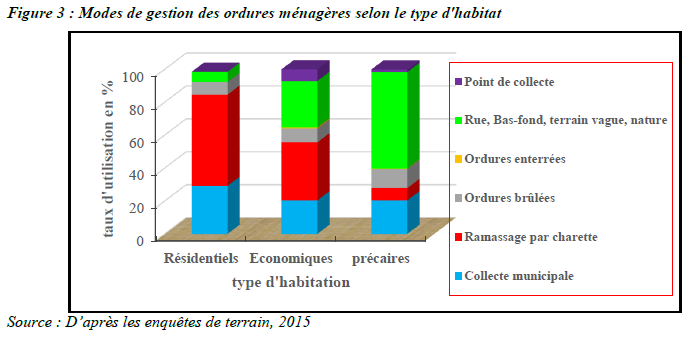 L’analyse du graphique 1 montre que l’élimination des ordures ménagères dans les rues, basfonds, terrains vagues ou nature, à l’aide de pré-collecteurs, constituent les principaux modes d’évacuation des déchets ménagers des chefs de ménages enquêtés. En effet, sur les 472 chefs de ménages enquêtés, 225 chefs, soit 43,6% de l’ensemble des enquêtés ont recours aux dépôts sauvages (dans les rues, les caniveaux à ciel ouvert, les parcelles inhabitées…) pour l’évacuation des déchets solides comme à Daloa (40,2%) selon P. Tuoet al. (2016, p. 206). La collecte par charrette est le mode le plus dominant dans les quartiers à habitats résidentiels et