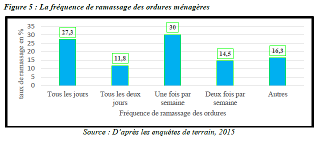 L’analyse du graphique 3 montre que, 30 % des chefs de ménages enquêtés estiment que les services de la Mairie chargés de la collecte passent une fois dans la semaine devant leur concession tandis que 27,3% ont affirmé, qu’ils sont réguliers chaque jour. Les faibles interventions dans la collecte des ordures ont été aussi soulignées par P. Tuo et al. (2016, p. 206) à Daloa et à Aboisso (G. M. Niamké, 2016, p. 131). Les services de collecte municipaux indiquent des points de groupage où les ordures doivent être collectées. Cependant, leur localisation géographique constitue un obstacle à leur utilisation dans les villes ou quartiers. Le ramassage mobile initié avec les camions ou tricycles constituent une innovation dans la collecte des ordures. Mais l’irrégularité de passe, la dégradation du réseau routier existant et l’inaccessibilité de certaines zones ne permettent pas une meilleure gestion des déchets solides. La fréquence de ramassage joue un rôle hygiénique fondamental. En effet, quand les ordures ne sont pas enlevées, elles se décomposent au lieu de stockage et peuvent non seulement occasionner des odeurs nauséabondes mais aussi être des zones de refuge pour les mouches, les souris, les cafards, nuisibles à la santé. Le réseau d’assainissement ne couvre pas tous les quartiers et est mal entretenu. Il est saturé et démodé occasionnant la stagnation des eaux usées par endroit dans la ville. L’insuffisance et le manque d’entretien du réseau de drainage des eaux pluviales, rendent impraticables les voies de circulation de la ville. Le manque de contrôle de la réalisation des fosses septiques dans les ménages pour l’évacuation des eaux usées domestiques entraine leur écoulement régulier dans les rues, caniveaux à ciel ouvert, marécages, etc. La déficience du système d’assainissement est fréquente dans les villes des pays en développement comme Abidjan en Côte d’Ivoire (P. Tuo, 2015, p. 42), Rufisque au Sénégal (I. Sy, 2006, p.90).