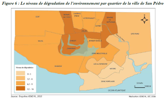 Dans l’ensemble, la moyenne du niveau de dégradation de l’environnement est de 7,6 et se situe dans l’intervalle de 6,1 à 9. Par conséquent, San Pédro est considéré comme une ville insalubre comme Daloa (M. Coulibaly 2016, p. 145). La carte 3 met en relief quatre groupes de quartiers dans la ville de San Pédro selon le niveau de dégradation de l’environnement. Les quartiers salubres avec un niveau de dégradation compris entre 0 et 3 comprennent les quartiers à habitats résidentiels(Zone portuaire et Nitoro).Les quartiers peu salubres, avec un niveau de dégradation se situant entre 3,1 et 6 sont composés des quartiers à habitats économiques(Lac ou Sonouko et Cité Poro). Avec un niveau de dégradation compris entre 6,1 et 9, les quartiers insalubres comprennent Zone Industrielle, Soleil, Scaf, Bardot Dioula, Digboué, Sotref, Victor Ballet et Château d’Eau appelés aussi quartiers précaires et évolutifs. Les quartiers très insalubres ont un niveau de dégradation entre 9,1 et 16. Ce sont les quartiers à habitats précaires et évolutifs tels que Bardot, CMA ou Thanry, Colas, Zimbabwé et Séwéké l’un des quartiers à habitats économiques.