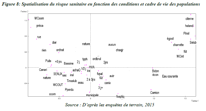Les variables prises en compte dans l’AFCM sont les variables :v001 (quartier), v003 (niveau d’instruction), v004 (type d’habitat), v005 (matériaux du mur), v006 (lieu d’aisance), v007 (approvisionnement en eau potable), v008 (moyens de conservation) v009 (nombre de jour de conservation d’eau), v010 (principal mode d’évacuation des eaux), v011 (mode de vidange des latrines), v012 (principal mode de cuisson), v013 (mode de conditionnement des ordures), v014 (nombre de jours de conditionnement ), v015 (principal mode d’évacuation des ordures), v016 (problème de ramassage des ordures), v017 (problème d’évacuation des eaux usées), v018 (état de stagnation des eaux dans le quartier), v019 (maladies), v020 (taille du ménage).Toutes ces variables ont permis de spatialiser les pathologies en fonction des conditions et cadre de vie des populations (graphique 4). L’ensemble de ces facteurs contribuent à eux seuls pour 77,6% de l’inertie de l’axe 1 : Analyse des correspondances multiples.