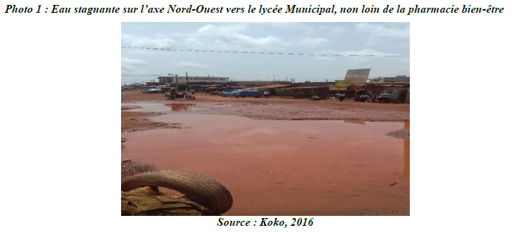 La ville de San Pédro dispose d’un réseau de drainage constitué de caniveaux à ciel ouvert ou enterrés le long de certaines de voies de communication, mis en place lors de sa création dans les quartiers légaux comme la zone industrielle au Sud. Ce système draine les eaux vers les plans d’eau (la lagune Digboué et les lacs artificiels). La présence de nombreux thalwegs facilite le drainage des eaux vers la lagune Digboué pour les quartiers situés au Sud de la route de Grand-Béréby et vers le fleuve San Pédro pour les quartiers du Nord. Le problème majeur concernant le réseau de drainage est son manque d’entretien. De ce fait, le système de drainage est défectueux et contribue à la dégradation de la voirie. Aussi, l’obstruction des caniveaux à ciel ouvert entraine le ruissellement des eaux sur les voies de communication, rendant ainsi difficile la circulation urbaine comme le montre la photo 1.