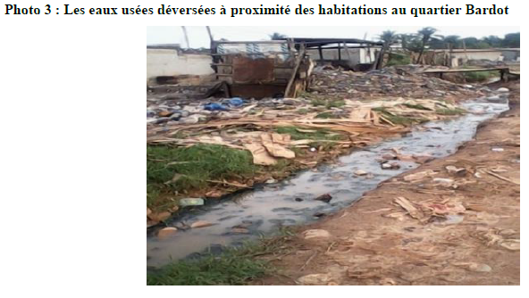 La ville de San Pédro dispose, dans les zones d’habitat loties, d’un réseau de drainage bétonné à ciel ouvert ou enterré, mis en place lors de la création de la ville. L’analyse du graphique 2 montre que les réseaux d’égout constituent à 78,5% les principaux lieux d’évacuation des eaux usées des résidents des quartiers résidentiels. Quant aux habitants des quartiers à habitats économiques, ils rejettent les eaux usées à 27,5% dans les fosses septiques. Concernant les quartiers précaires et évolutifs, les rues ou cours (photo3) constituent à 50,8% les lieux d’évacuation des eaux usées comme à Brazzaville (P. Vennetier, 1988, p. 21).Chaque ménage