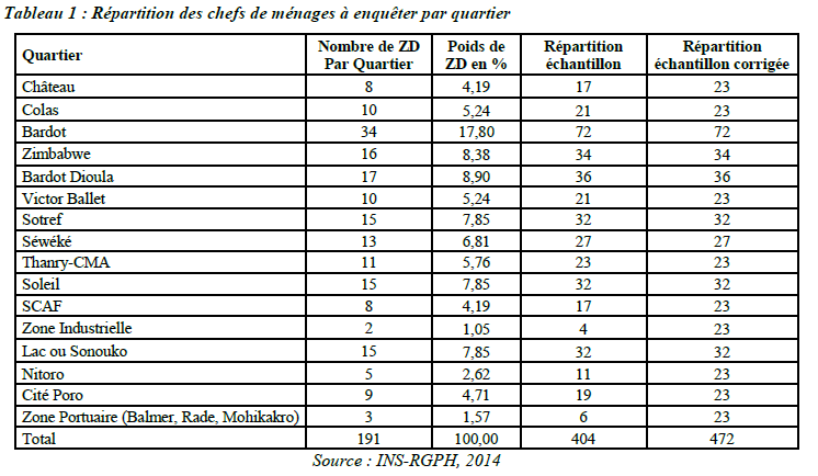 Pour les ZD comprenant au maximum 23 îlots, une division du nombre de ménages par le nombre d’îlots a été faite. Concernant les ZD de plus de 23 îlots, les numéros des îlots ont été inscrits et un tirage aléatoire a été effectué. Au cas où on a un ménage à enquêter dans un îlot de plusieurs logements, un choix des indices comme un point d’eau stagnante, ordures ménagères et le type d’habitat a été opéré pour choisir le ménage le plus proche de l’un ou de ces indices. Quand il s’agit de plusieurs ménages à interroger dans un seul îlot, on a procédé à un pas de 5 ou 10 selon l’importance des logements dans l’îlot. En somme, l’enquête a porté sur 472 chefs de ménages repartis sur l’ensemble des quartiers de la ville. Le questionnaire a été administré au chef de ménage ou à défaut à sa conjointe.