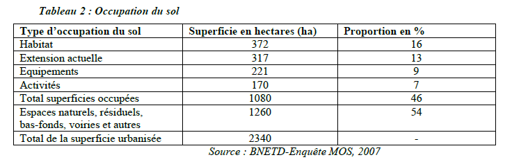 Au-delà de son empreinte sur la morphologie de la ville, l’impact du site est encore plus déterminant sur la viabilité du système d’assainissement. Née d’un port, la ville de San Pédro a connu une croissance spatiale rapide (Ministère d’Etat, Ministère du plan et du développement, 2007, p. 102). Le site choisi convient au port, mais en revanche on ne peut en dire autant pour la ville. Les marécages et les fortes pentes sont des obstacles à l’urbanisation. Ainsi, il n’y a pas de mètre carré de terrain qui n’ait pas fait l’objet de travaux de terrassement. Les zones industrielles qui étaient implantées loin des habitations se trouvent aujourd’hui en pleine ville, car le manque de logements a occasionné la construction du quartier Séwéké dans le prolongement de l’espace réservé aux unités industrielles. On assiste à une propension de l’habitat spontané avec une dégradation inquiétante du cadre de vie, mettant plus de 70 % de la population urbaine dans une précarité environnementale. L’habitat précaire occupe le quart de la superficie urbaine (Ministère d’Etat, Ministère du plan et du développement, 2007, p. 102). Les espaces naturels et non constructibles sont plus étendus que les espaces constructibles (tableau 2).