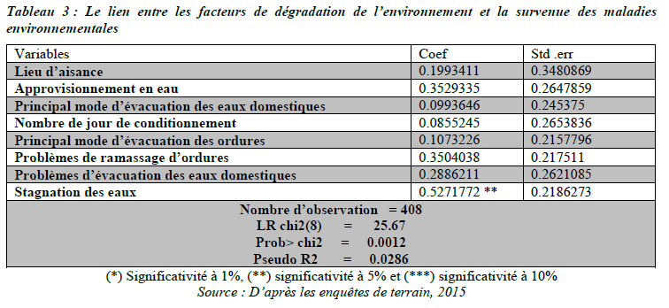 Toutes ces variables explicatives interviennent dans la survenue des maladies dites environnementales, mais seule une variable est significative au seuil de 5%. Il s’agit de la variable stagnation des eaux. La variable dépendante dans la survenue de ces maladies est liée aux problèmes d’évacuation des eaux dans plusieurs secteurs de la ville. Le coefficient associé à cette variable est significatif au seuil de 5%. Cette variable augmente la probabilité de 52% des chefs de ménages proches des retenues d’eau d’être exposés aux maladies environnementales. Le tableau 4 permet de voir les effets marginaux de chaque variable dans l’apparition des maladies environnementales.