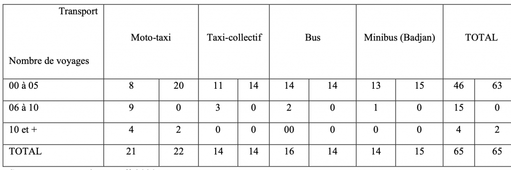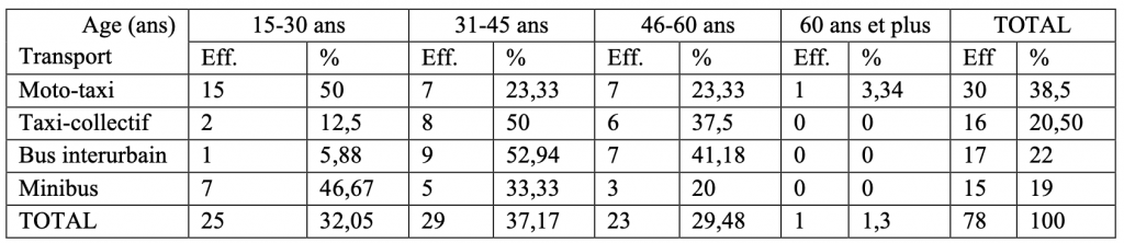 Outre que les usagers des transports se retrouvent dans tous les secteurs d’activités, le tableau 3 révèle que leur âge oscille en moyenne entre les tranches de 31-45 ans (28,33 %) et de 46-60 ans (36,11 %). Ils sont majoritairement des salariés du privé, du public et des commerçants. Les déplacements occasionnels concernent surtout la tranche de 15-30 ans (20,57 %). En tenant compte de l’âge, les usagers ne sont pas, dans l’ensemble, une population à risque, ce qui explique qu’ils aient continué à se déplacer malgré la mesure de confinement.