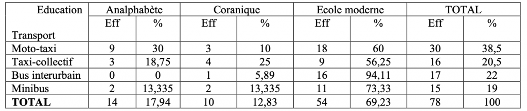 A ce niveau, il y a trois indicateurs : l’analphabète, l’éducation coranique et l’école moderne. Dans le 1er indicateur cité, il y a 14 opérateurs de transport ; le second en 10 et le dernier, 54 opérateurs de transport. La majorité des opérateurs de transport ont fait l’école moderne, ce qui suppose qu’ils sont capables de comprendre et de s’approprier les mesures barrières.