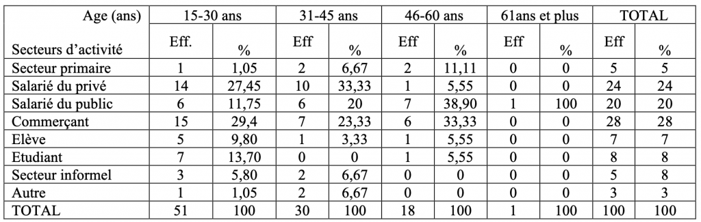 Pour caractériser cette variable, nous avons pris en compte trois indicateurs : le secteur d’activité, l’âge et l’éducation des usagers des transports de Korhogo.