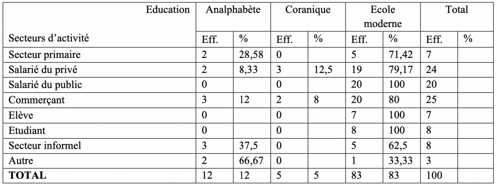 Le tableau 4, ci-dessous, montre que les usagers ayant eu une éducation moderne sont majoritaires (83 individus) contre 12 individus qui se déclare « analphabète » et 05 qui disent avoir fait l’école « coranique ». Le poids des individus ayant fait l’école moderne dans l’échantillon enquêté suggère la compréhension de la mesure de distanciation physique pour réduire les risques de propagation de la COVID-19.